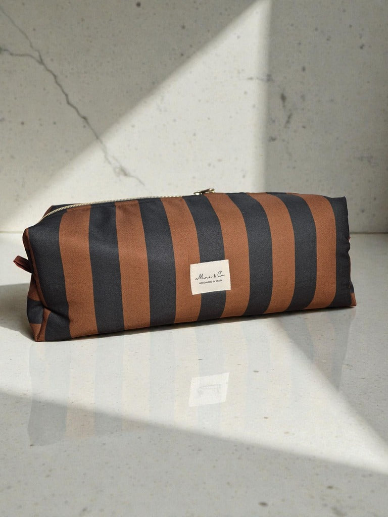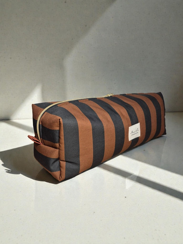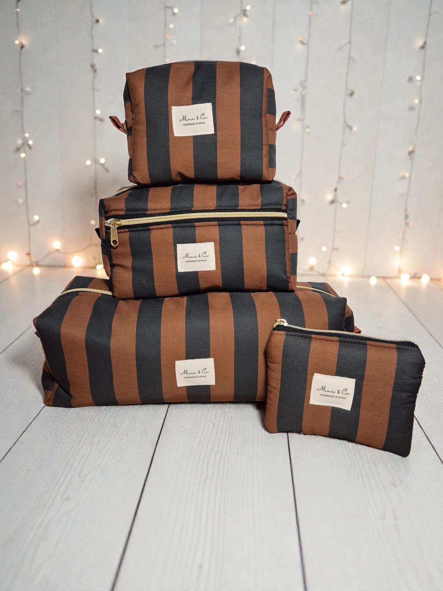 Organiza tus rutinas de belleza con este neceser grande, confeccionado a mano en algodón orgánico y un suave acolchado que protege lo que más importa. Su diseño de rayas negro y marrón, combinado con una cremallera negra y dorada, aporta un toque elegante y actual.