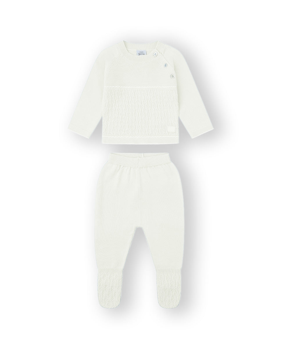 Conjunto de primera puesta de tricot en color crudo. Cierra con botones en el lateral.