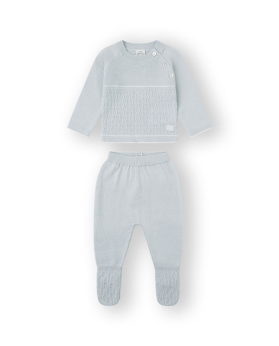 Conjunto de primera puesta de tricot en color gris claro. Cierra con botones en el lateral.