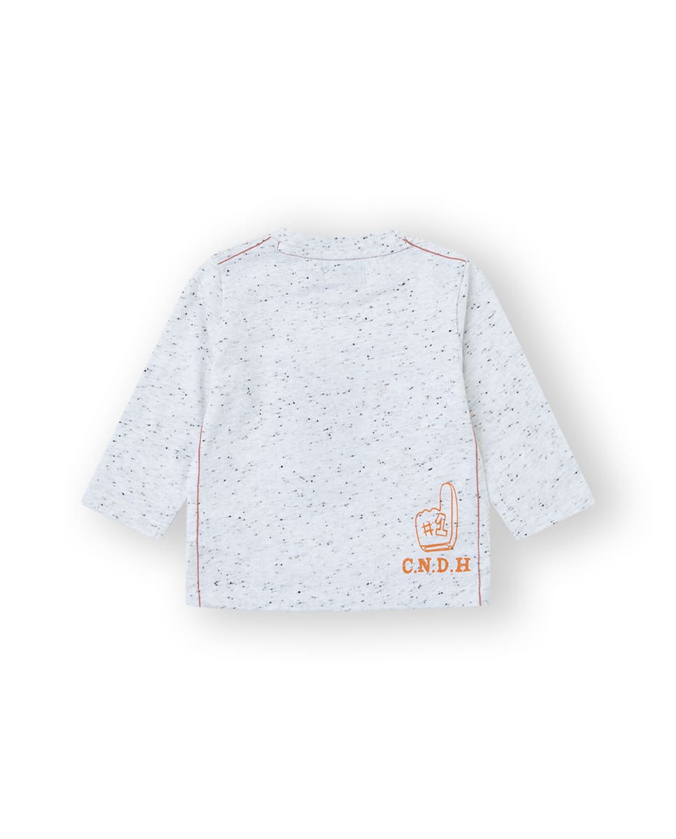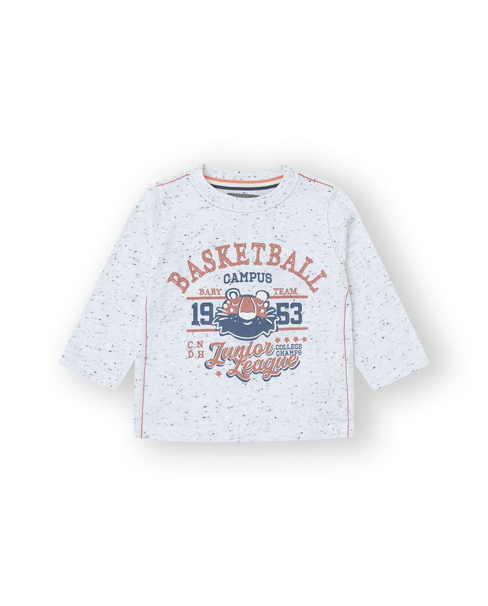 Camiseta de algodón gris claro con dibujo en el pecho.