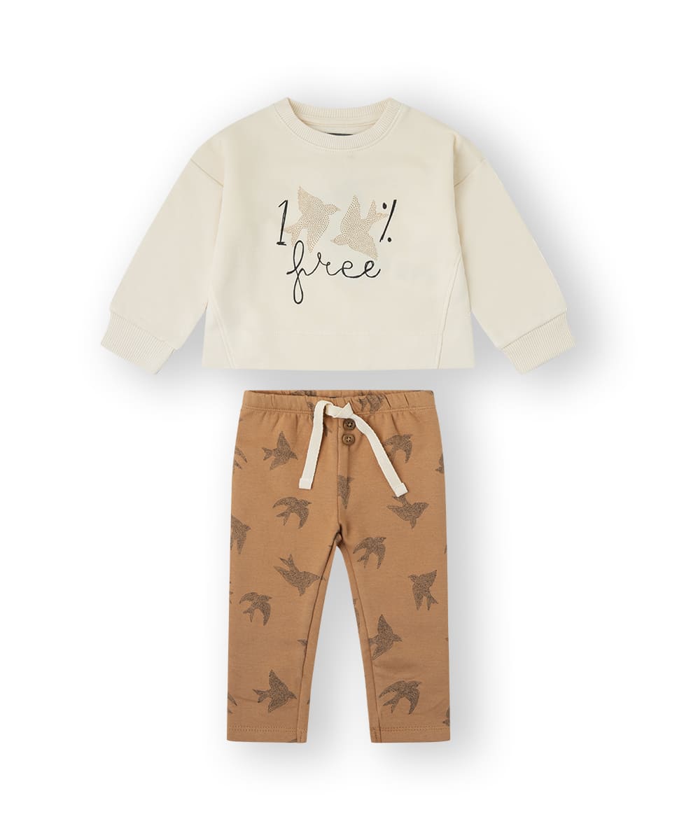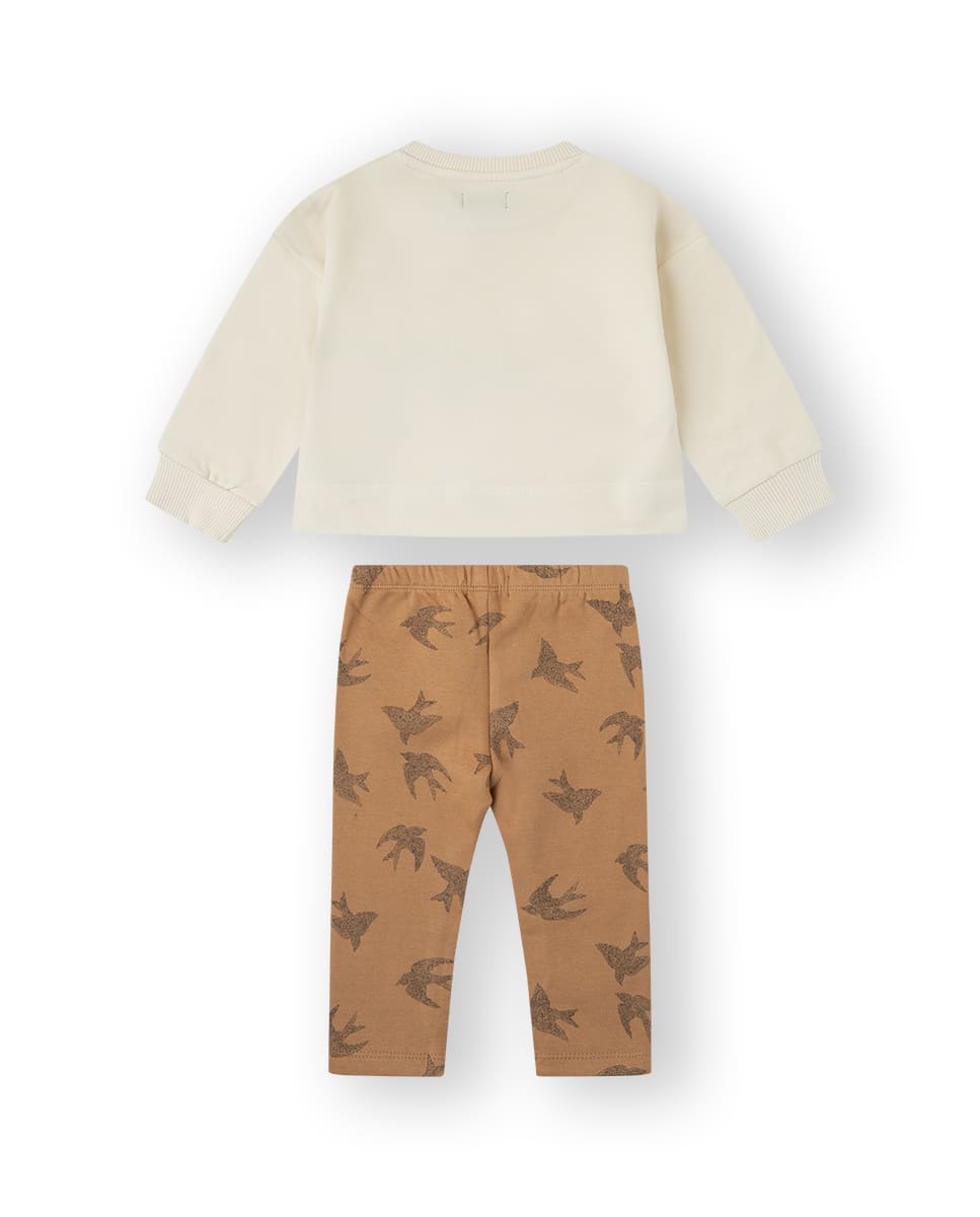 Conjunto de dos piezas de sudadera afelpada en su interior con detalle de golondrinas y texto en el pecho y leggings afelpados con estampado de golondrinas.