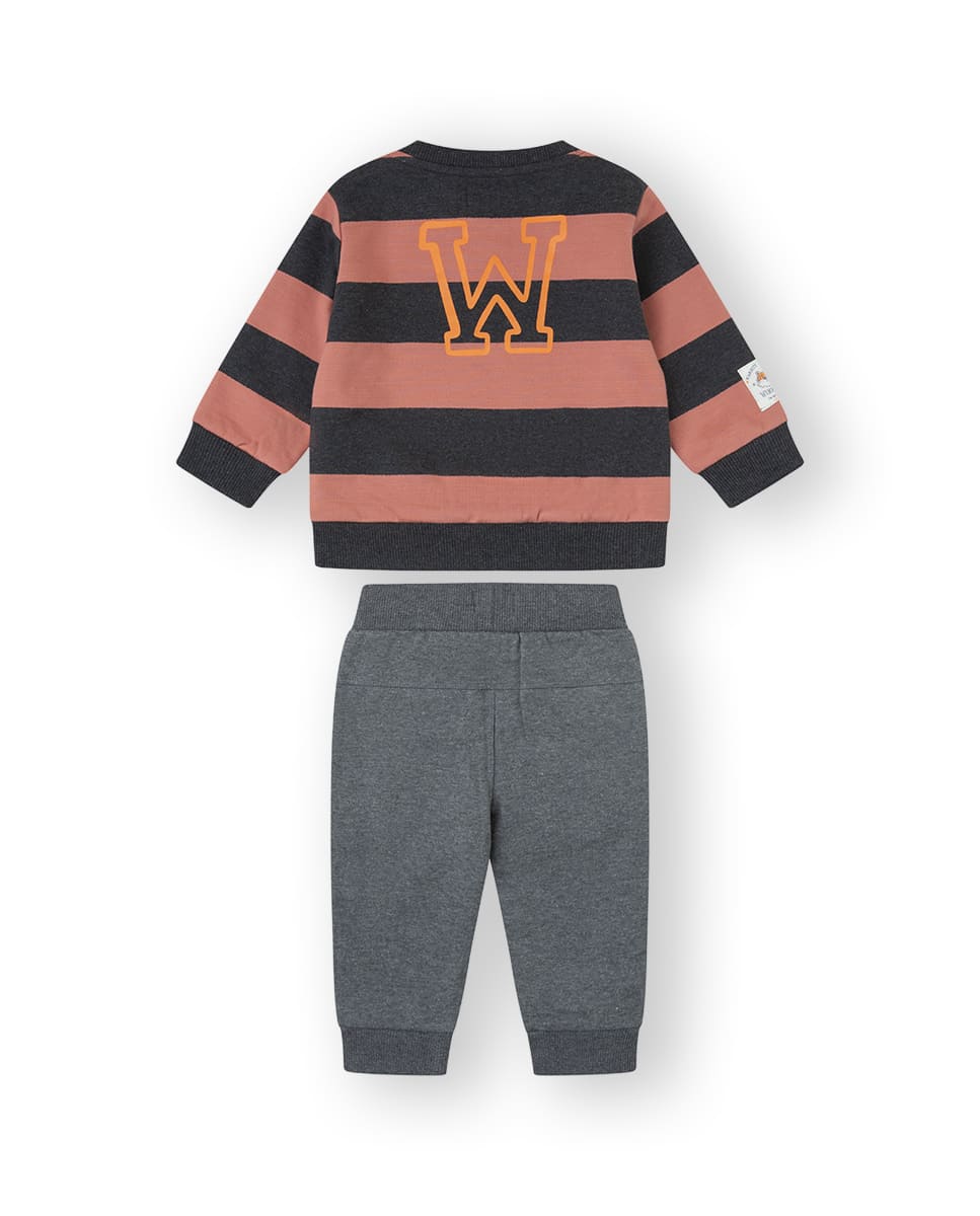 Conjunto de dos piezas con sudadera de rayas en color gris oscuro y naranja. Pantalón baggy color gris oscuro.
