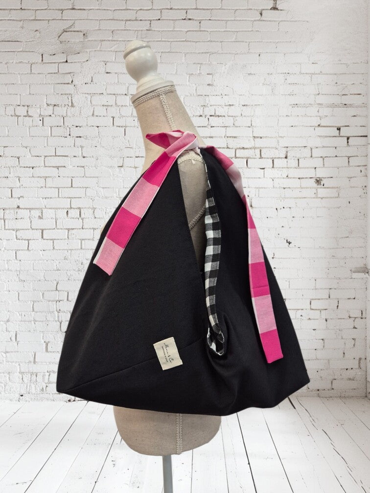 Por un lado con loneta estampada de vichy negro, el otro lado en loneta negro y el cierre con loneta en vichy rosa fucsia.