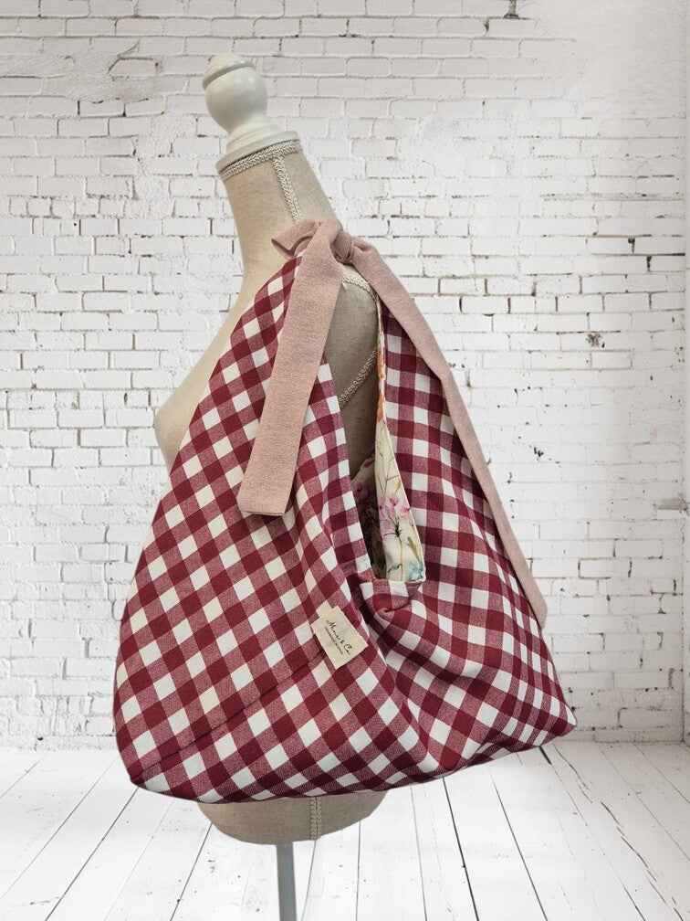 Realizado por un lado con loneta en vichy rojo oscuro, el otro lado loneta de flores y el cierre con loneta en rosa claro.