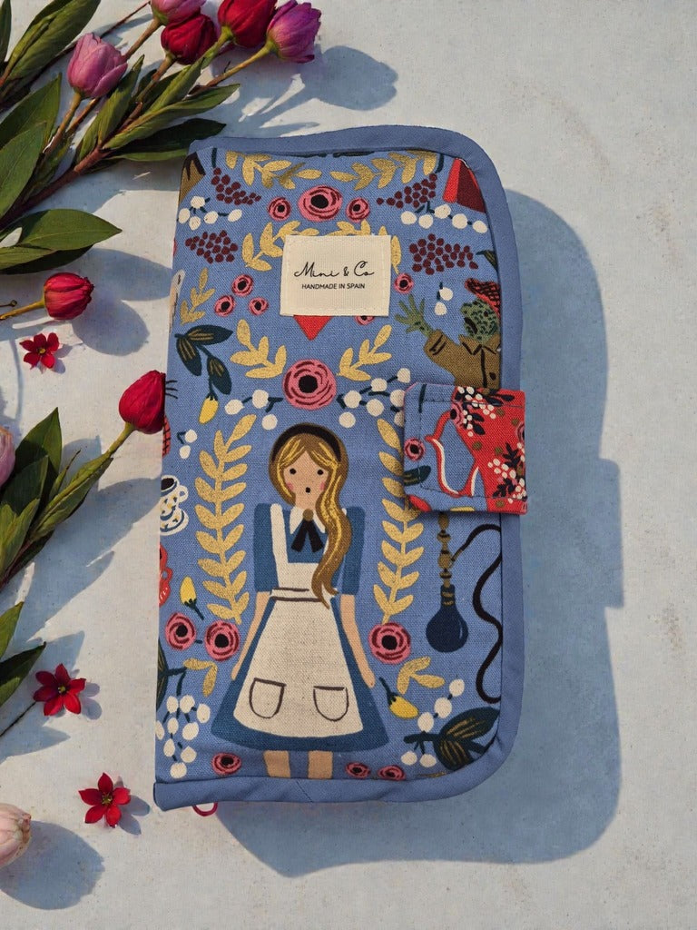 Debido a la naturaleza del corte de la tela, la posición exacta de los personajes (la Reina, el Sombrerero, etc.) puede variar ligeramente en cada neceser, haciendo que cada pieza sea única.
