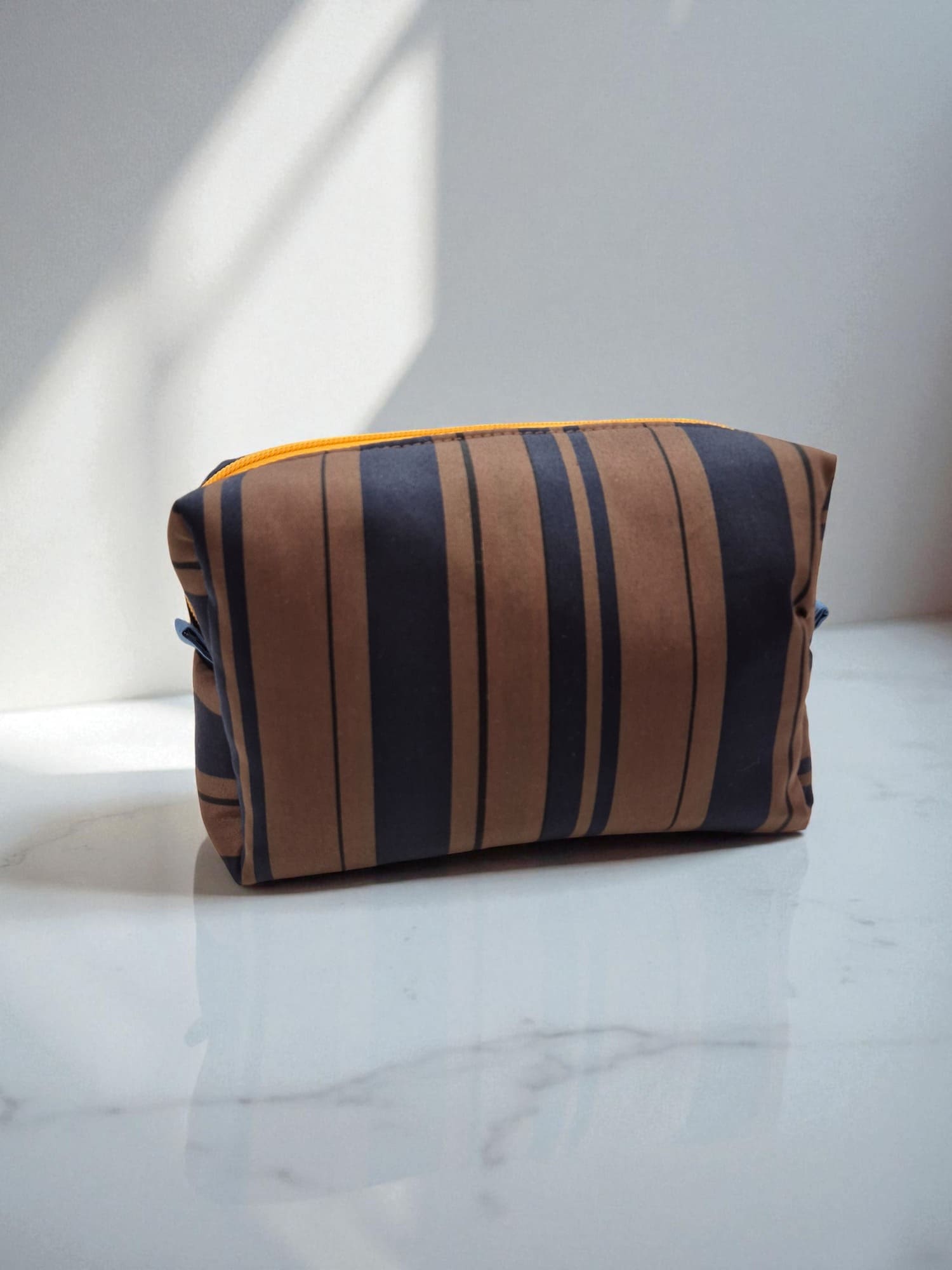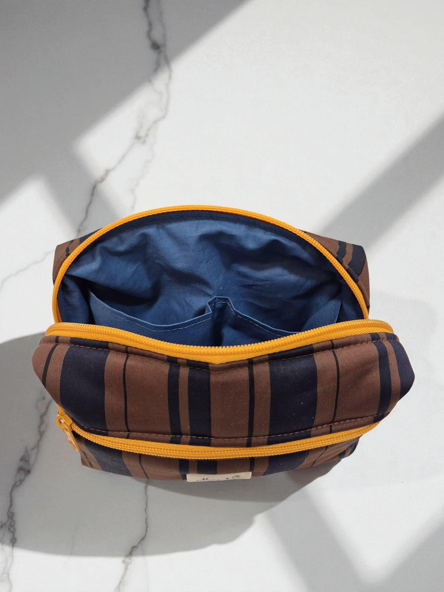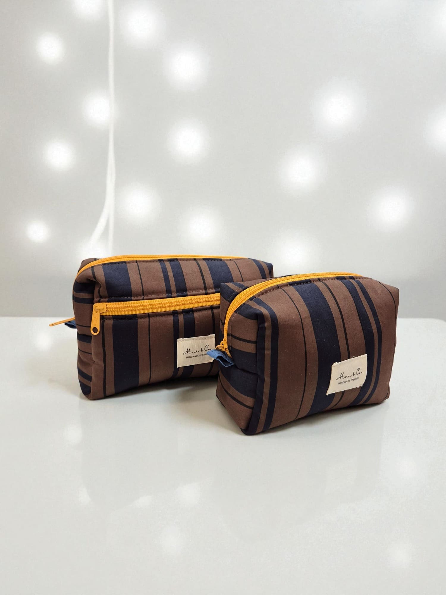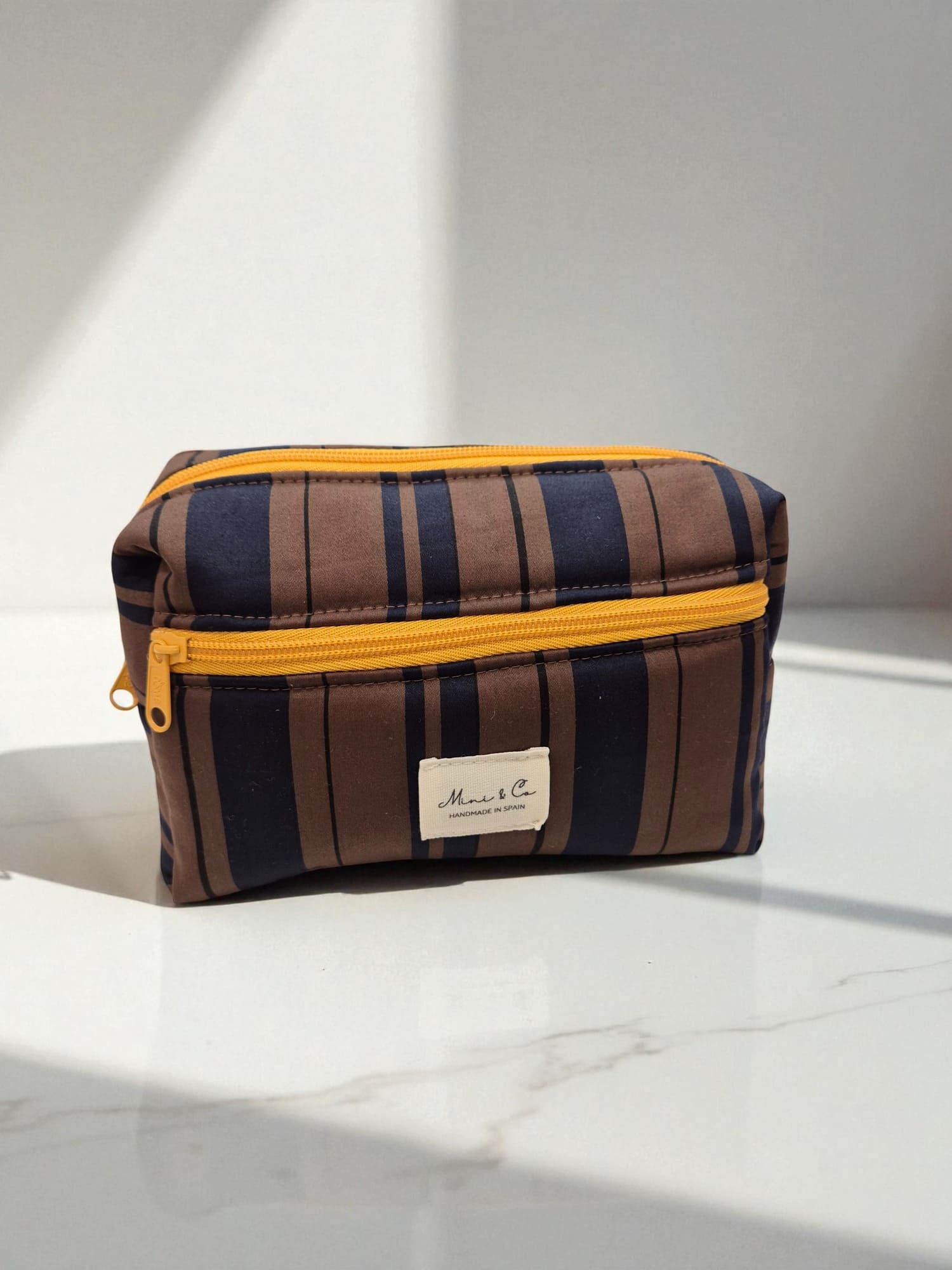 Este neceser de tamaño mediano combina estilo y organización en un diseño práctico para el día a día. Confeccionado en tejido marrón y marino, incluye una cremallera mostaza que aporta un contraste moderno y un interior azul resistente y fácil de limpiar.