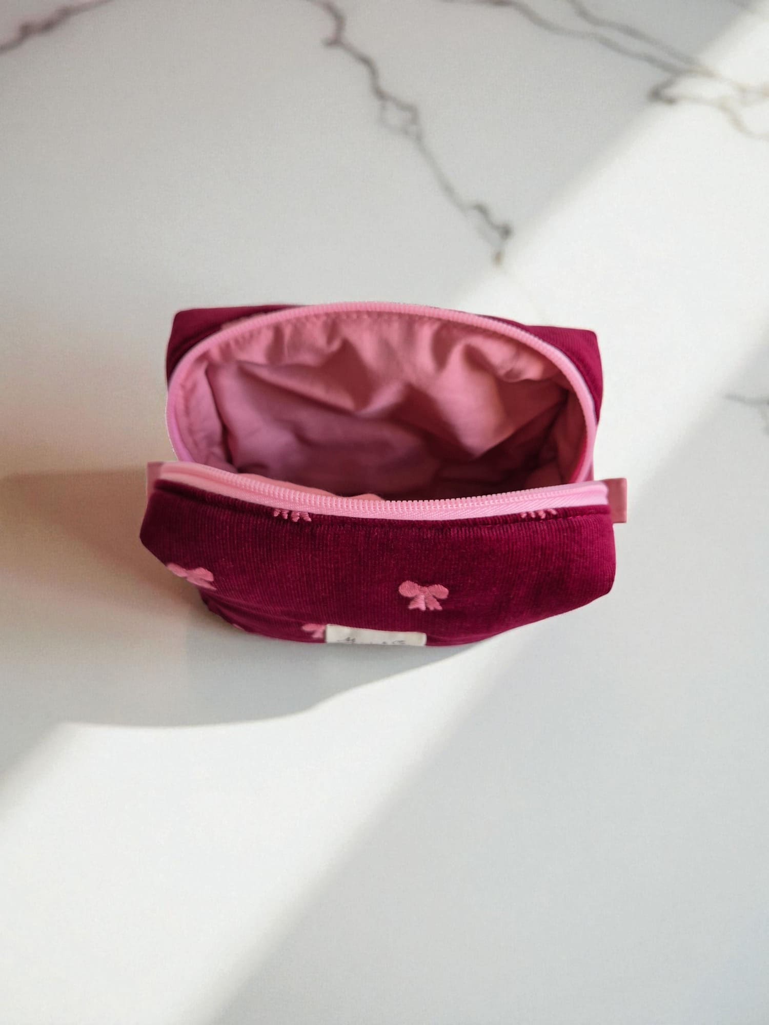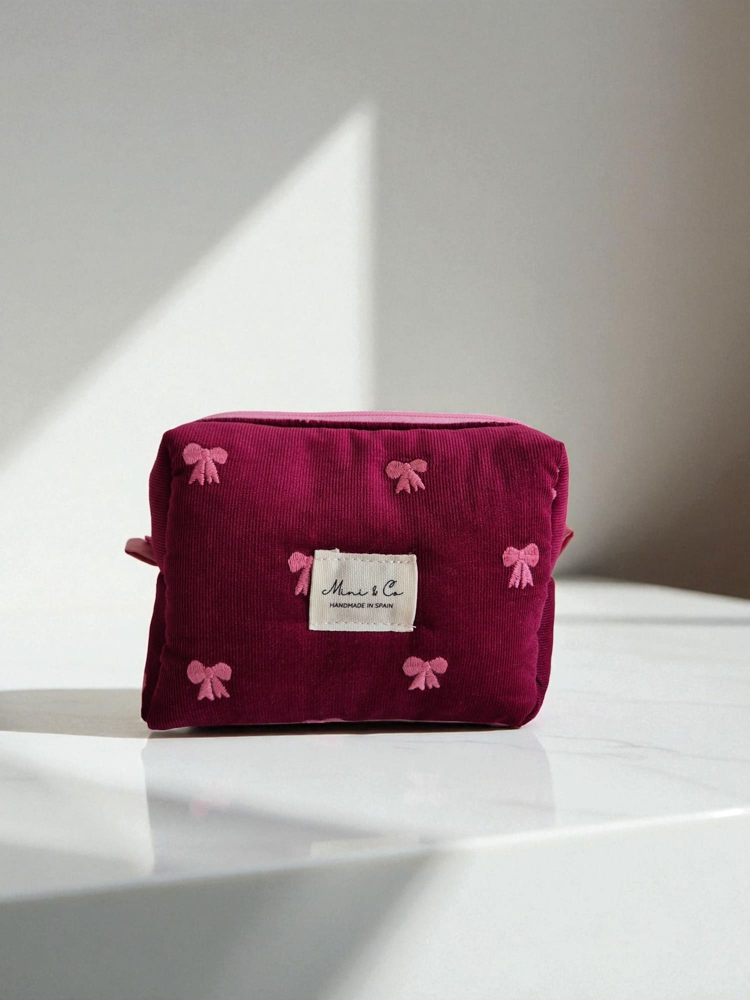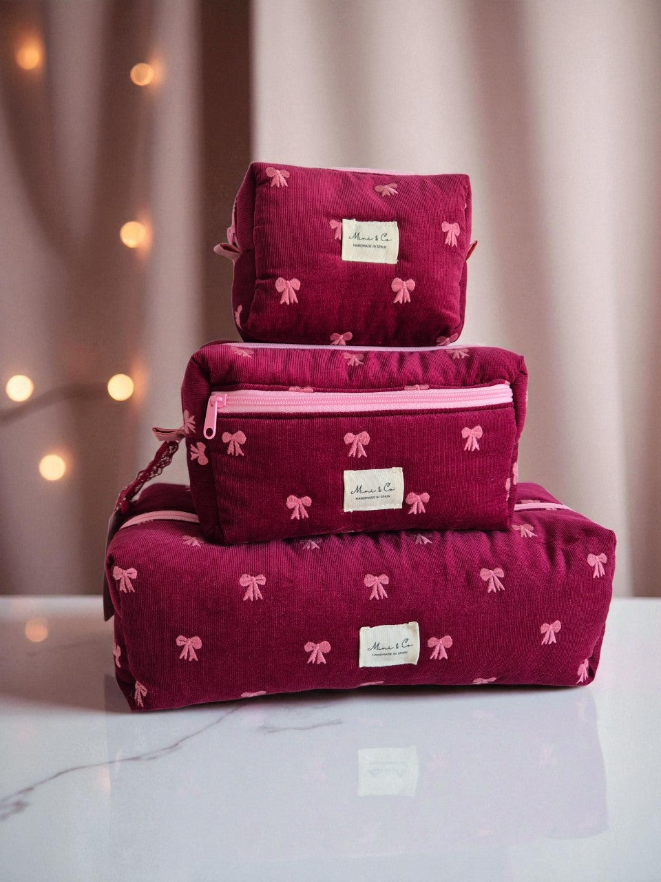 El neceser mediano en pana cereza con lazos bordados es el equilibrio perfecto entre estilo y practicidad. De tamaño compacto pero con espacio suficiente para lo esencial, es ideal para llevar en el bolso o tener tus básicos siempre organizados.