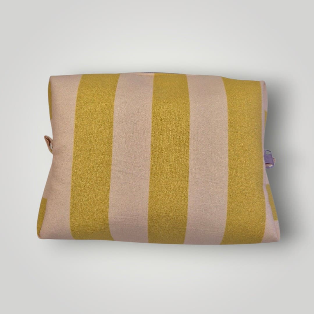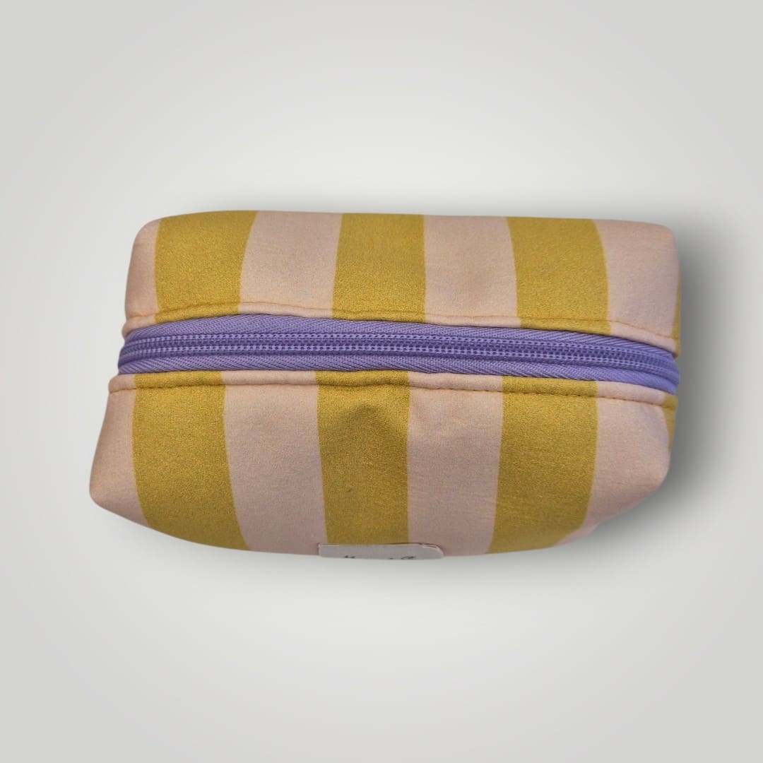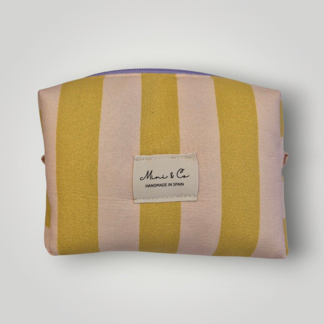 Este neceser mediano combina rayas en tonos amarillos y rosa claro con un interior lavanda que invita a la calma. Cada detalle, desde la cremallera hasta el forro, está pensado para transmitir alegría y suavidad. Ideal para guardar lo esencial con estilo y para acompañarte en cualquier escapada con ese toque de color que siempre alegra el día.