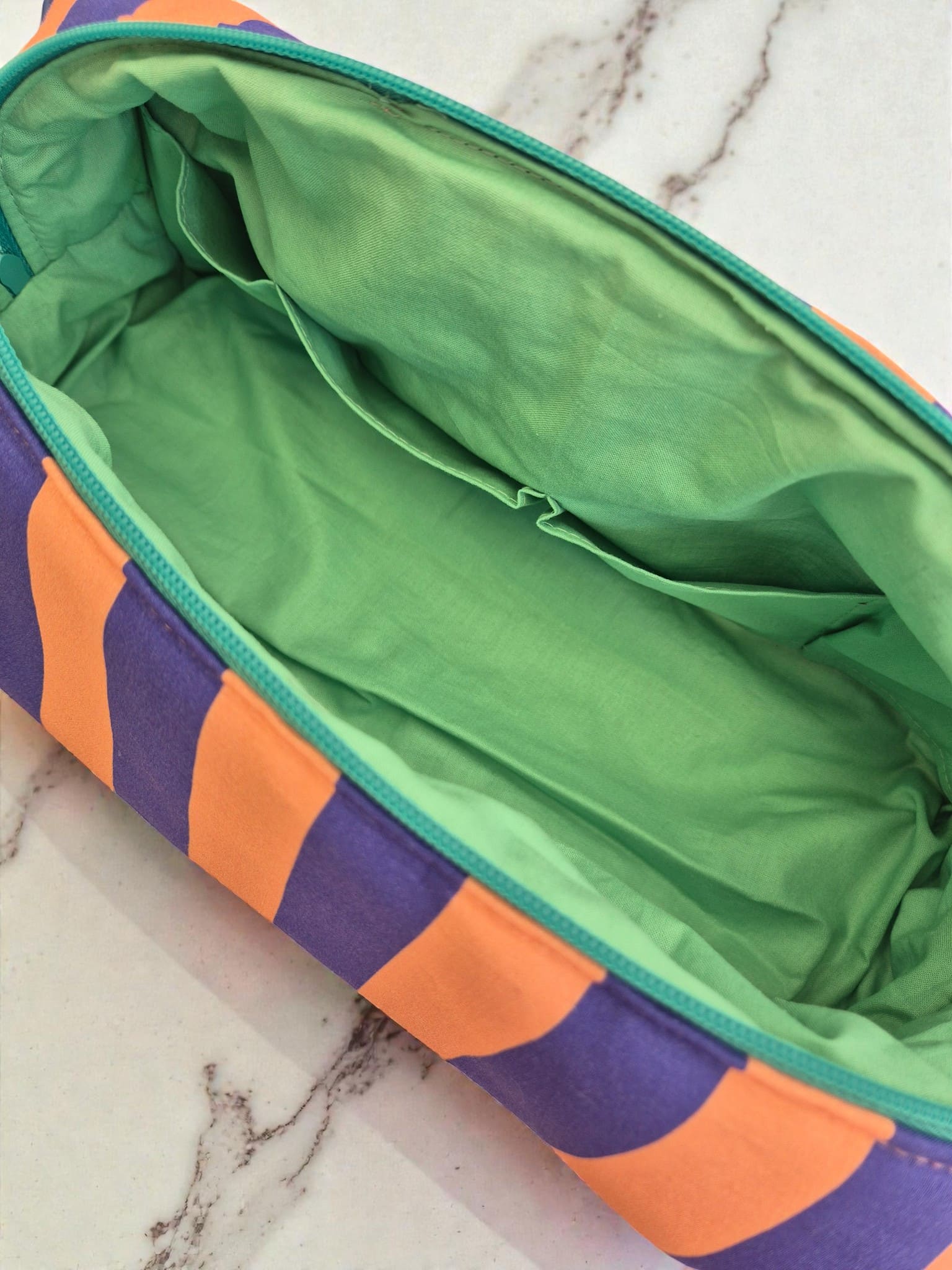 Organiza tus rutinas de belleza con este neceser grande, confeccionado a mano en algodón orgánico y un suave acolchado que protege lo que más importa. Su diseño de rayas azules y rosas, combinado con una cremallera verde, aporta un toque elegante y actual.