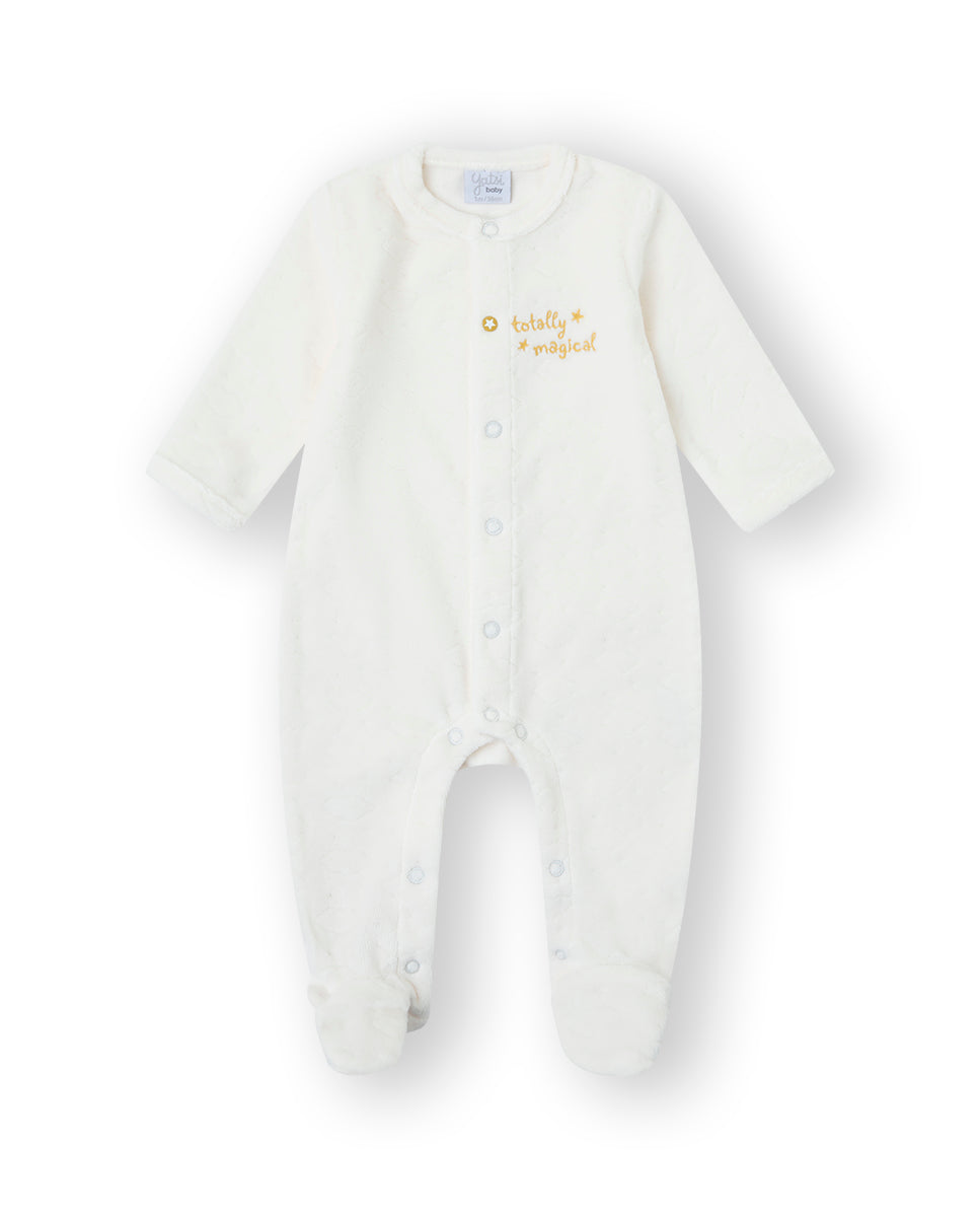 Pelele blanco de terciopelo con grabado de nubes.
