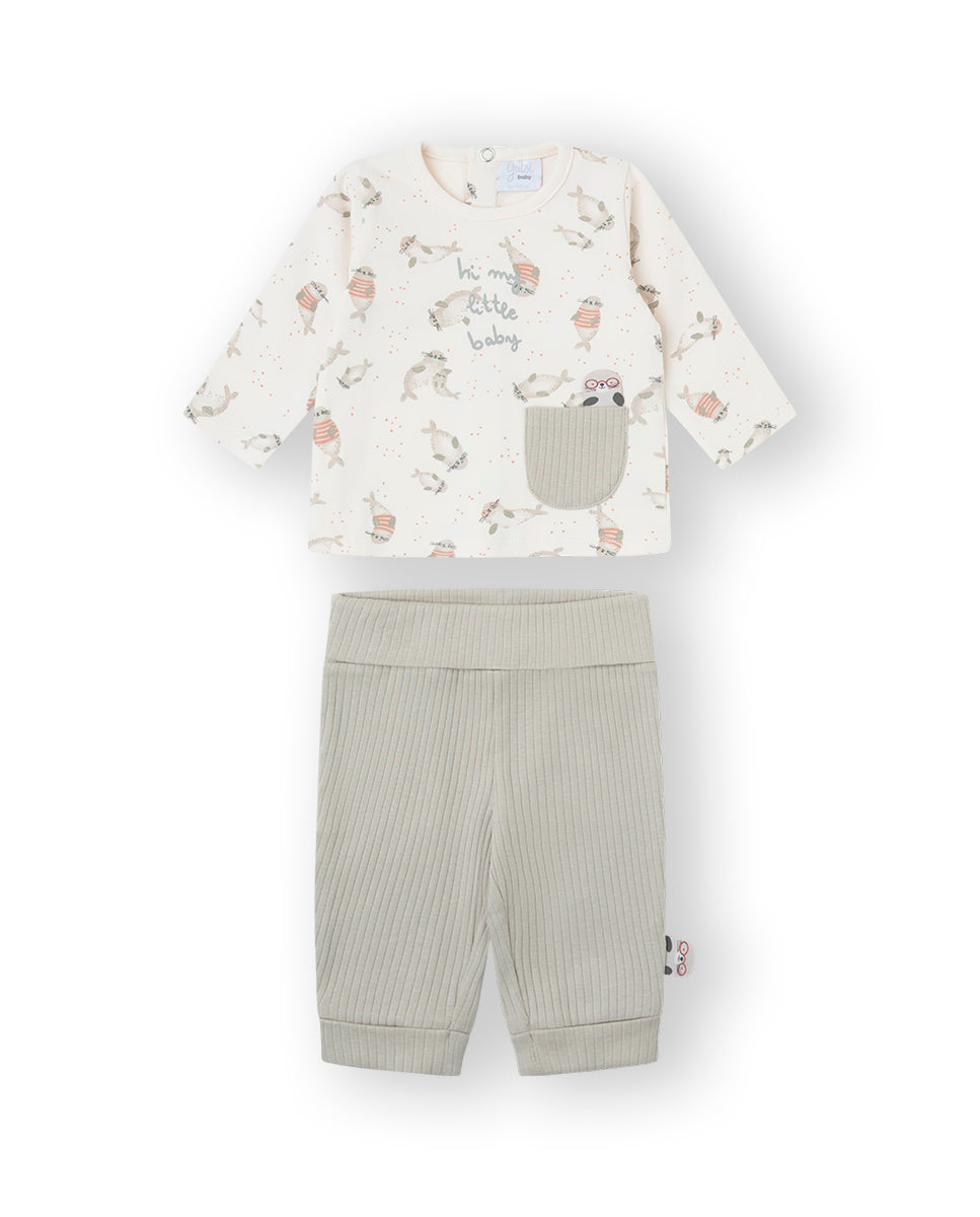 Pijama compuesto de pantalón de canalé y camiseta con estampado de focas. Detalle de bolsillo.