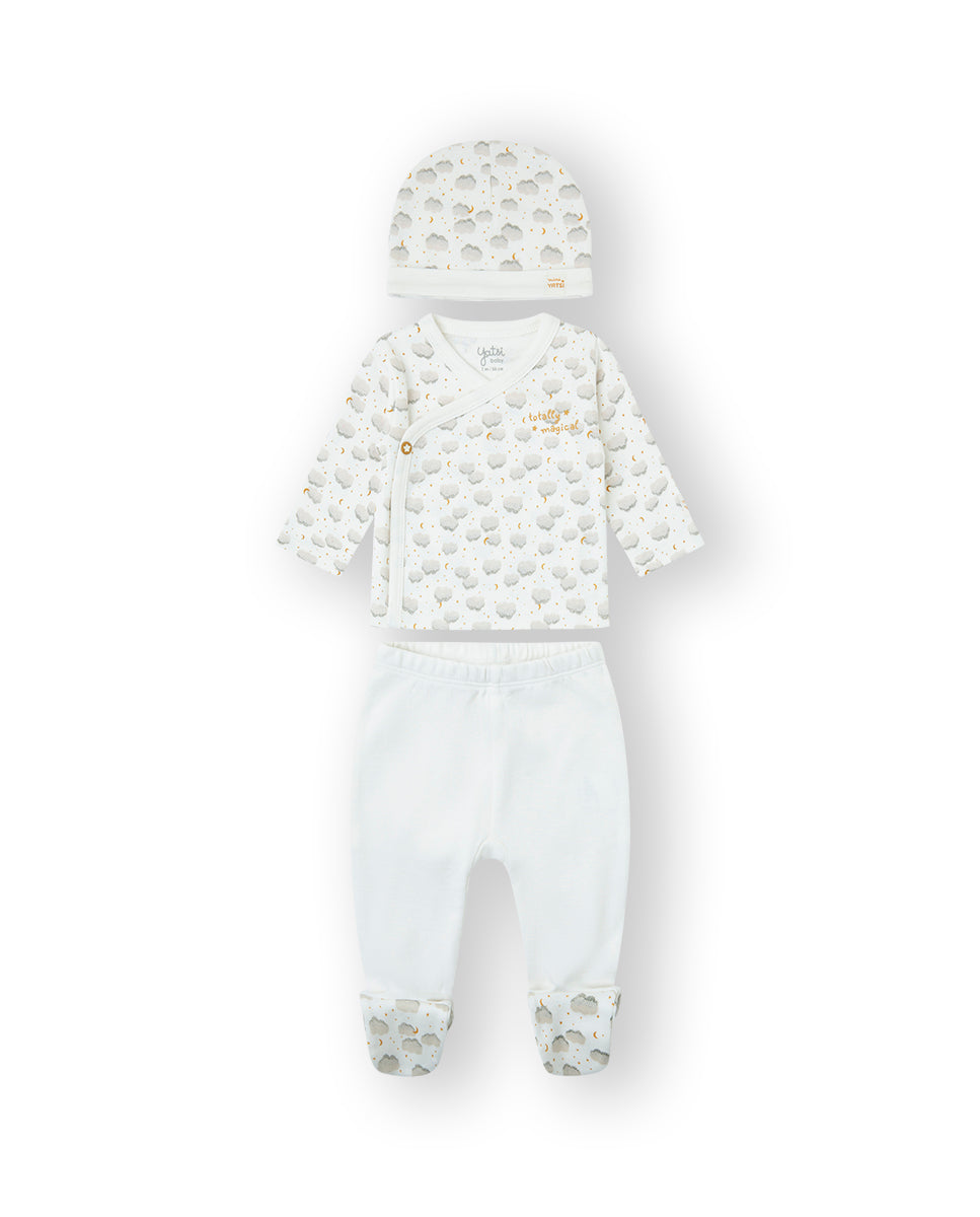 Conjunto primera puesta de 3 piezas con estampado de nubes.
